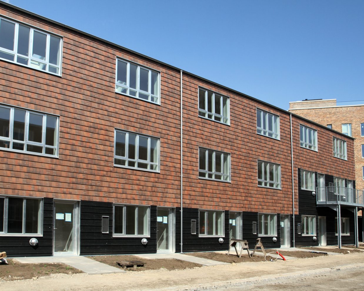 De bæredygtige rækkehuse er af træ med et tag beklædt med sort tagpap med indbyggede solceller og ovenlysvinduer. Rækkehusene er opført i et, to eller tre plan med have og/eller altan. Enkelte boliger er opført uden have eller altan.