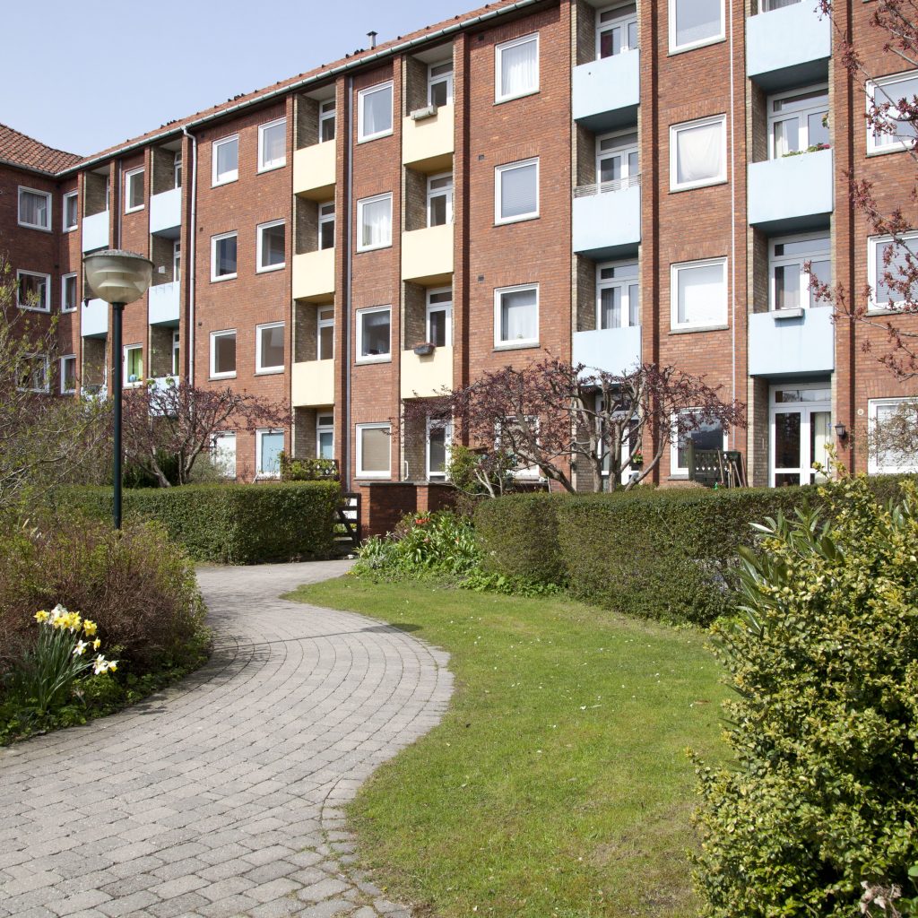Langs bebyggelsens nordøstlige fløj er der terrasser til stuelejlighederne.